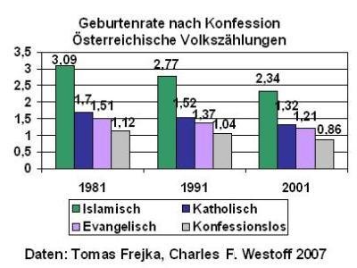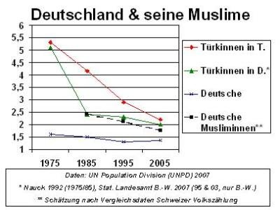 Angesichts der in Deutschland seit Jahrzehnten nicht mittels ordentlicher Volkszählung durch einschlägige Erhebungen ermittelten religiösen Zusammensetzung der Bevölkerung, musste ein Vergleich der entsprechenden demoskopischen Daten aus der Schweiz des Jahres 2000 zeigen, dass eingebürgerte Musliminnen im Durchschnitt noch weniger Kinder (1,73) als ihre noch ausländischen Glaubensschwestern (2,49) gebaren. Deutschland und Europa werden also "nicht" islamisch, sondern unterteilen sich in kinderarm-alternde, säkulare Bevölkerungsschichten und darin kinderreiche "Inseln" christlicher, islamischer, jüdischer und anderer Glaubensgemeinschaften.[7]