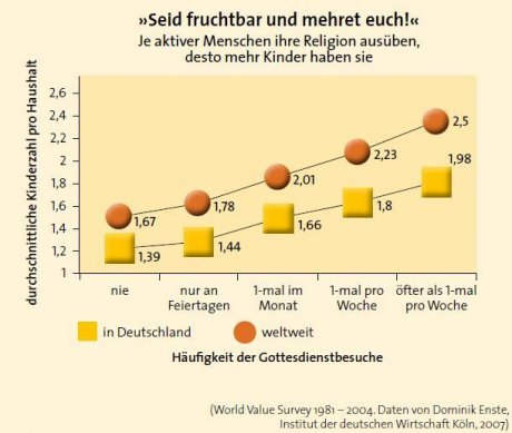 Praktizierende Anhänger von Religionen bringen im Durchschnitt weltweit durchschnittlich mehr Nachwuchs hervor, d. h. sind reproduktiv erfolgreicher als Menschen mit säkularer Lebenseinstellung aus der gleichen gesellschaftlichen Schicht.