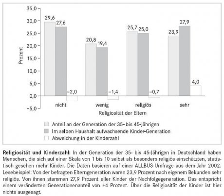 Ein wesentlicher Grund dürfte sein, dass gemeinschaftsbezogene Formen von Religiosität weltweit und quer durch alle Weltreligionen über die Entfaltung einer Vielzahl von Familienformen regelmäßig mit einer durchschnittlich höheren Kinderzahl einhergehen. Im Falle von Religionsgemeinschaften, die nicht (oder nicht mehr) erfolgreich transzendent verankerte Gründe für Familiengründung vermitteln sowie Bildungs- und Betreuungseinrichtungen errichten, scheint die Fortpflanzungsrate sich zwangsläufig zu verringern. Religiosität ist nicht die einzige Variable menschlichen Familienverhaltens, aber sie ist empirisch nachweisbar wirksam.[6]