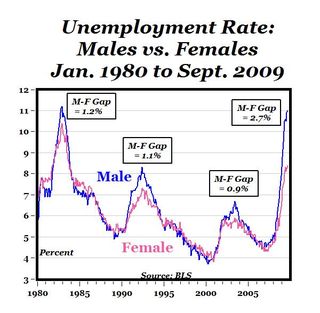 In den USA haben in der letzten Wirtschaftskrise 2008 feministische Gruppen Lobbyarbeit betrieben, damit der größte Anteil des neuen Stimulusprogramms (American Recovery and Reinvestment Act, 2009, in Höhe von 787 Milliarden USD) für die Wirtschaft weiblich dominierten Branchen zugute kommt - obwohl diese während der Krise keine Arbeitsstellen abgebaut haben, während in männlich dominierten Branchen wie Bauwirtschaft und Industrie 3 Millionen Arbeitsstellen verloren gingen. Die Arbeitslosigkeit bei Männern liegt nun um 3 Prozentpunkte höher als bei Frauen, somit ist der Unterschied höher als jemals zuvor in den letzten 30 Jahren. Die Schlagworte "mancession" und "sheconomy" beschrieben zwar plakativ, aber dennoch realitätsnah die unterschiedliche sozialökonomische Situation von Frauen und Männern.[19]