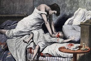 Milch gab sie, da er Wasser forderte, und Butter brachte sie dar in einer herrlichen Schale. Sie griff mit ihrer Hand den Nagel und mit ihrer Rechten den Schmiedhammer und schlug Sisera durch sein Haupt und zerquetschte und durchbohrte seine Schläfe. Zu ihren Füßen krümmte er sich, fiel nieder und legte sich; er krümmte sich, fiel nieder zu ihren Füßen; wie er sich krümmte, so lag er verderbt.» - Richter 5, 24-27[8] |