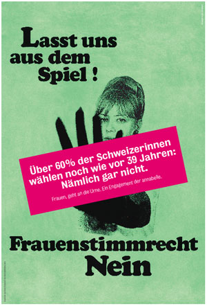 In der Schweiz dürfen Frauen erst seit 1971 wählen. Das Wahlrecht war dort an die Wehrpflicht gekoppelt. Erst nachdem die Verfassung geändert wurde, durften in der Schweiz auch Menschen wählen, denen keine Wehrpflicht auferlegt wird. (Ergebnis einer Volksentscheidung durch Männer!) Esther Vilar schreibt in Der dressierte Mann, dass "man in einem bestimmten Kanton die Frauen über die Einführung des Frauenwahlrechts selbst abstimmen [ließ] - die Mehrheit entschied sich dagegen."[4]