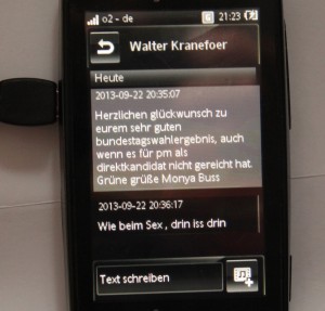 Zitat: «Herzlichen Glückwunsch zu eurem sehr guten Bundestagswahlergebnis, auch wenn es für pm [Anm. der Red.: Philipp Mißfelder] als Direktkandidat nicht gereicht hat. Grüne Grüße, Monya Buss»