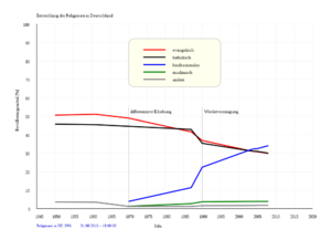 Jahrhunderte lang war Deutschland geprägt vom konfessionellen Gegensatz. Die Kulturgeschichte Mitteleuropas ist nicht verstehbar ohne die Konflikte und die Koexistenz zwischen Protestanten und Katholiken. Das Parteiensystem der frühen Bundesrepublik mit der Dominanz der christdemokratischen Parteien baute noch auf dieser Ordnung auf. Doch dann ereignete sich seit den 1960er Jahren eine stille Kulturrevolution. Irgendwann in den sechziger Jahren des 20. Jahrhunderts setzte eine Absetzbewegung von den Kirchen ein. Gemessen an den Kämpfen und Auseinandersetzungen der Vergangenheit vollzog sich diese Entwicklung relativ konfliktfrei und geräuschlos. Die alten Gegensätze zwischen Protestanten und Katholiken spielten plötzlich keine Rolle mehr, weil Kirche und Religion insgesamt an Bedeutung verloren. Ursache und Auswirkung dieser Entwicklung ist wissenschaftlich noch nicht völlig geklärt. Aber deutlich wird sie in dieser statistischen Darstellung. Die Wiedervereinigung[wp] hatte einen starken Effekt auf die Statistik, ist aber nicht allein und nicht einmal in der Hauptsache für den Anstieg der blauen Linie seit 1990 verantwortlich.[14]