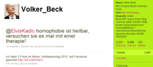 | Zitat: | «Heute will er nicht mehr so gern an seine Worte von damals erinnert werden, sind sie doch gar zu verräterisch. Auf Abgeordnetenwatch.de zeigt er sich entsetzt, daß das Buch aus den Achtzigern überhaupt noch erhältlich ist, wirft ein paar Nebelkerzen mit dem Verweis, daß das schließlich auch "die Wissenschaft" damals so gesehen habe, und sagt im übrigen, daß er dies heute nicht mehr so sehen würde. Allerdings: Wenn jemand ganz genau weiß, daß die Voraussetzung (A) nötig ist, um das Ziel (B) zu erreichen, und wenn dieser nach wie vor fleißig an dieser Voraussetzung (A) arbeitet, dann fällt es ziemlich schwer, ihm zu glauben, daß er das Ziel (B) nicht mehr verfolgen würde. Und mit dem Ausbau der Voraussetzung (A) - also der weiteren Homosexualisierung der Gesellschaft - ist Beck jedenfalls bis heute auf das heftigste beschäftigt: Gerade hat er heftig protestiert, weil die russische Polizei eine illegale Demonstration von Homosexuellen aufgelöst hat und spricht gar von "Deportation", wenn Rußland Ausländer, die daran teilgenommen haben, in ihre Heimatländer abschiebt. Mit unglaublich dreister Polemik kämpft er gegen den "Kongreß Psychotherapie und Seelsorge", der am kommenden Wochenende in Marburg stattfinden soll, weil dort auch Christl Vonholdt referiert, die Homosexuellen Ausstiegsmöglichkeiten eröffnet. Er ist auch immer noch Mitglied der Grünen, deren Jugendorganisation tatsächlich und wortwörtlich die "Abschaffung der Ehe" fordert sowie die Gleichstellung Homosexueller im Adoptionsrecht - was, soweit es den ersten Punkt betrifft, eine klar verfassungsfeindliche Position ist.»[20] |